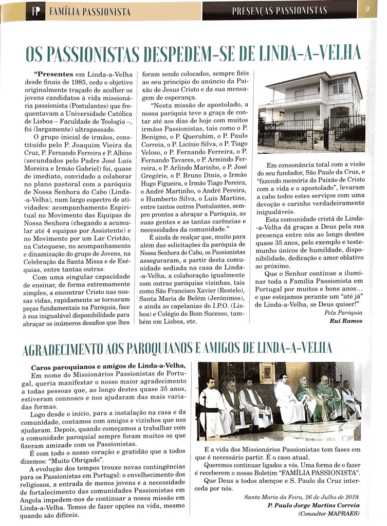 Em anexo, os artigos publicados na revista dos Padres Passionistas, sobre a sua presença em Linda-a-Velha.