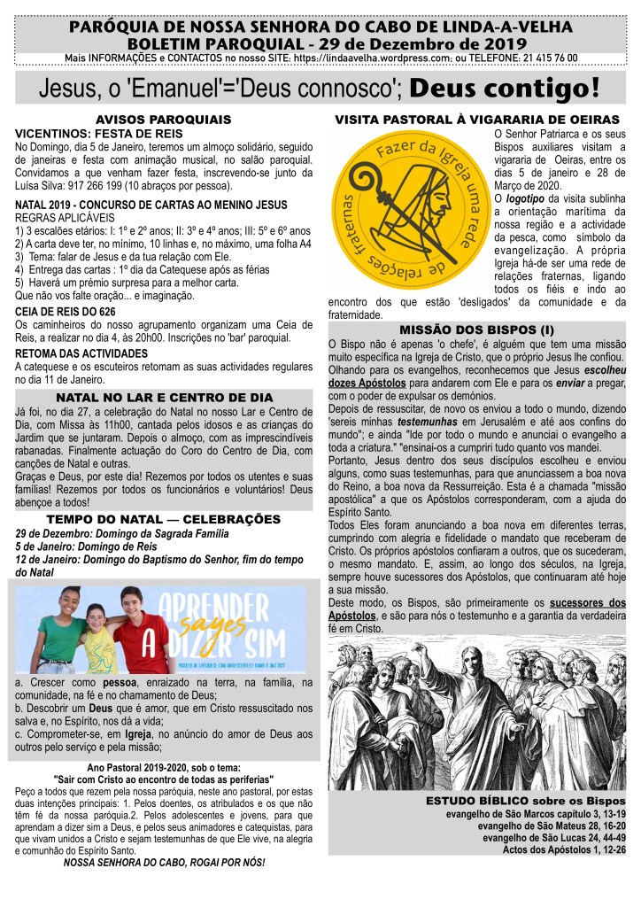Avisos e Boletim – paróquia de Linda-a-Velha – 29-12-2019