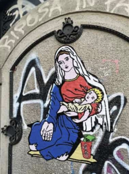 Esta obra repete-se em vários lugares na capital da Lombardia, a região mais afetada pela pandemia, assim como a imagem de ‘Maria com o menino Jesus’ que pede dinheiro com o mesmo copo: