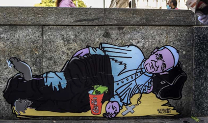 Alexsandro Palombo pintou o Papa Francisco como sem-abrigo, com um copo que aos olhos parece da famosa marca “coca cola” mas na qual escreve “Caritas”.