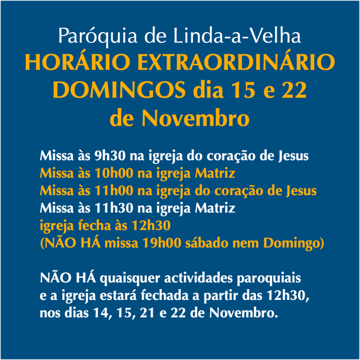 Nos dias 14-15, e 21-22, a partir das 13h00, não há actividades presenciais, não há Missas à tarde, a igreja estará fechada.