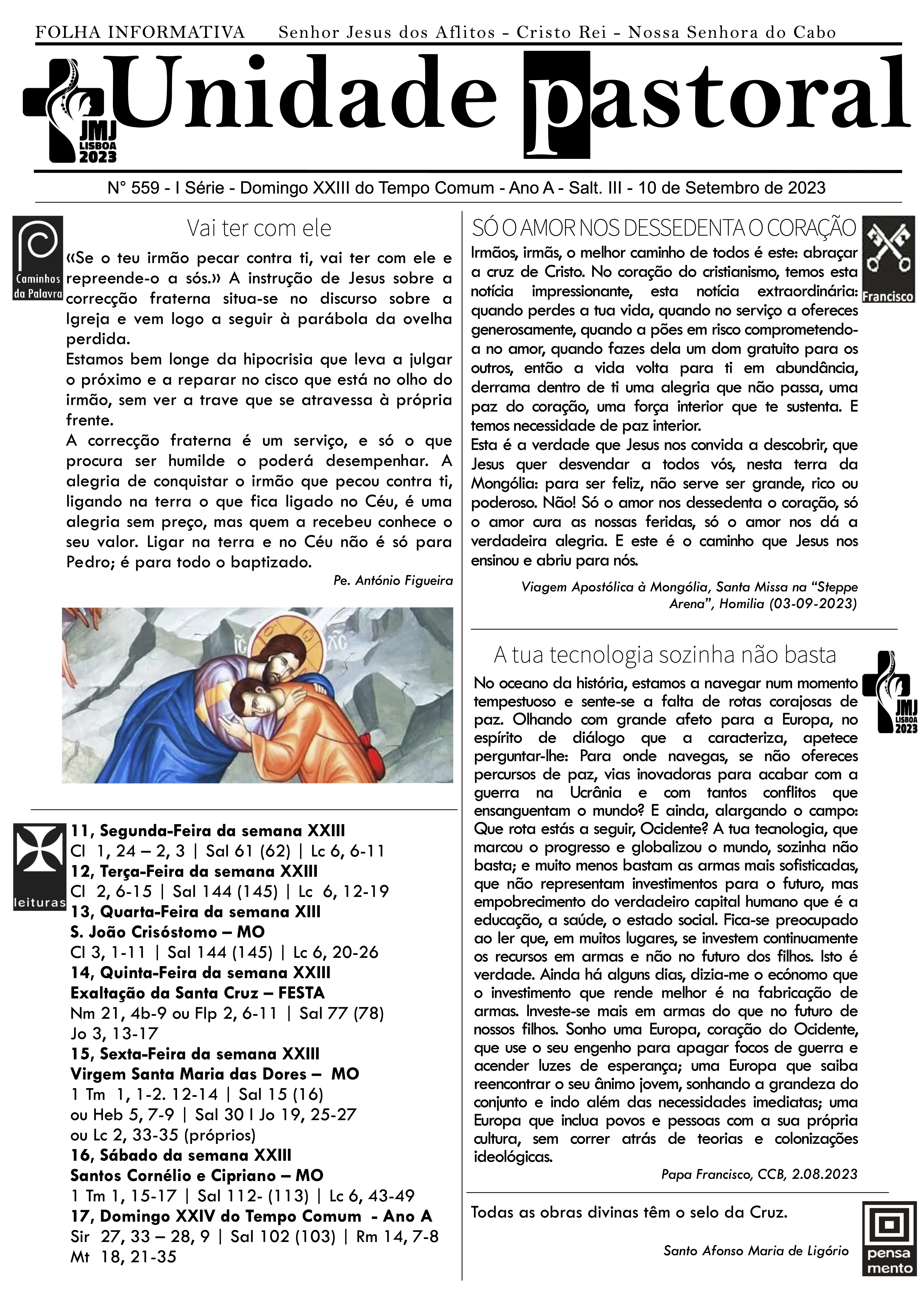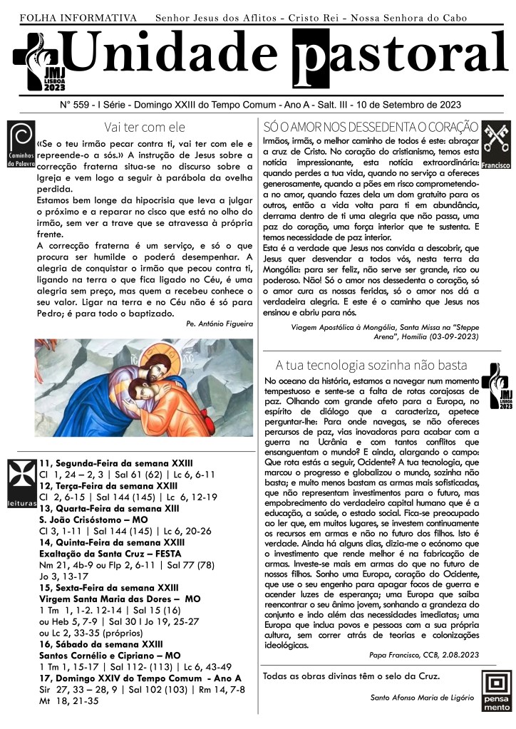 Os membros do Conselho Pastoral Paroquial têm reunião no dia 16 de Setembro, às 15h00, na igreja paroquial.