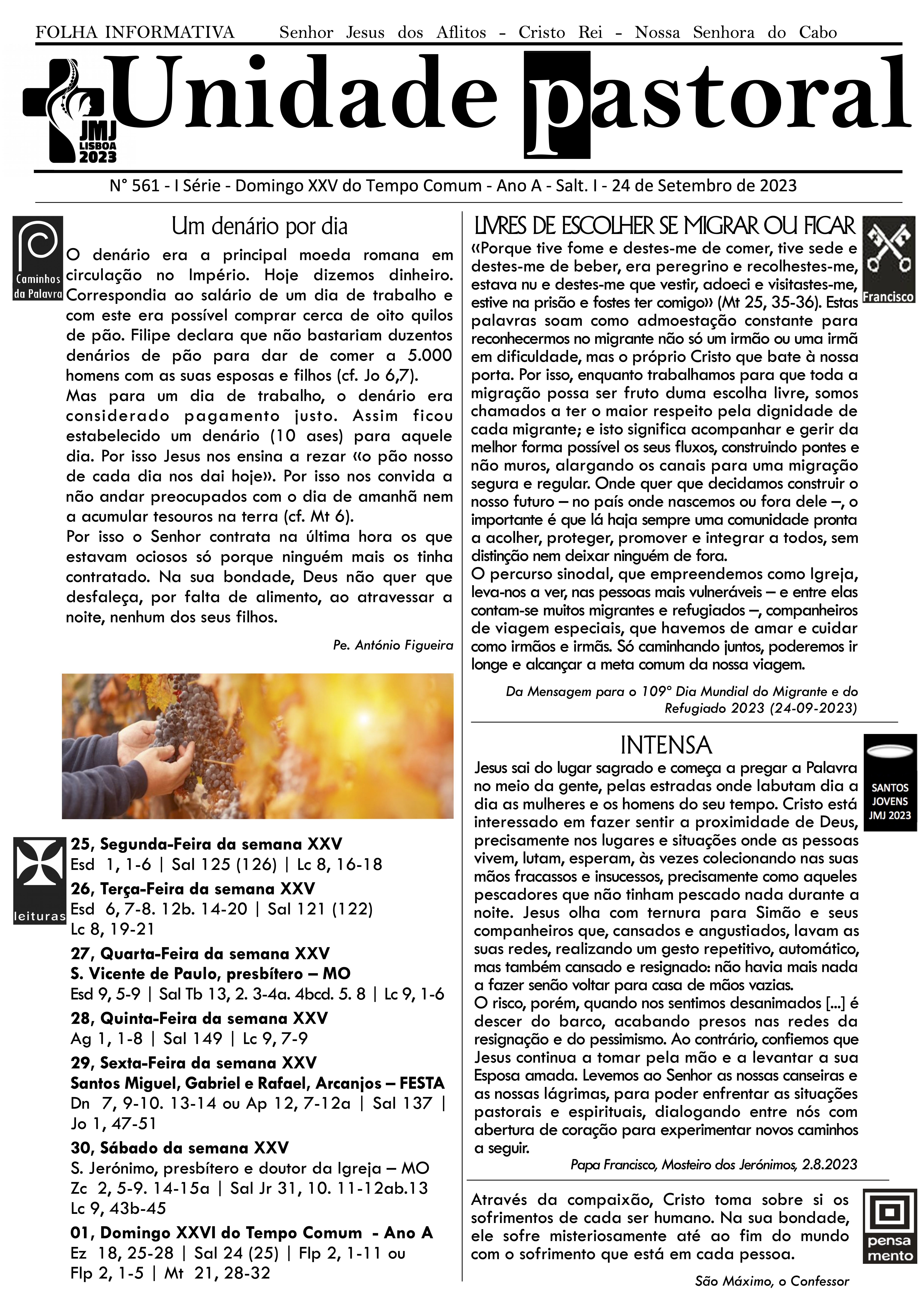 Teremos um encontro para celebrar, recordar e partilhar experiências da JMJ Lisboa 2023 aqui na nossa paróquia. Será no dia 4 de Outubro, começando às 19h00 com a Missa, segue-se jantar partilhado e exposição no salão paroquial. Todos estão convidados!