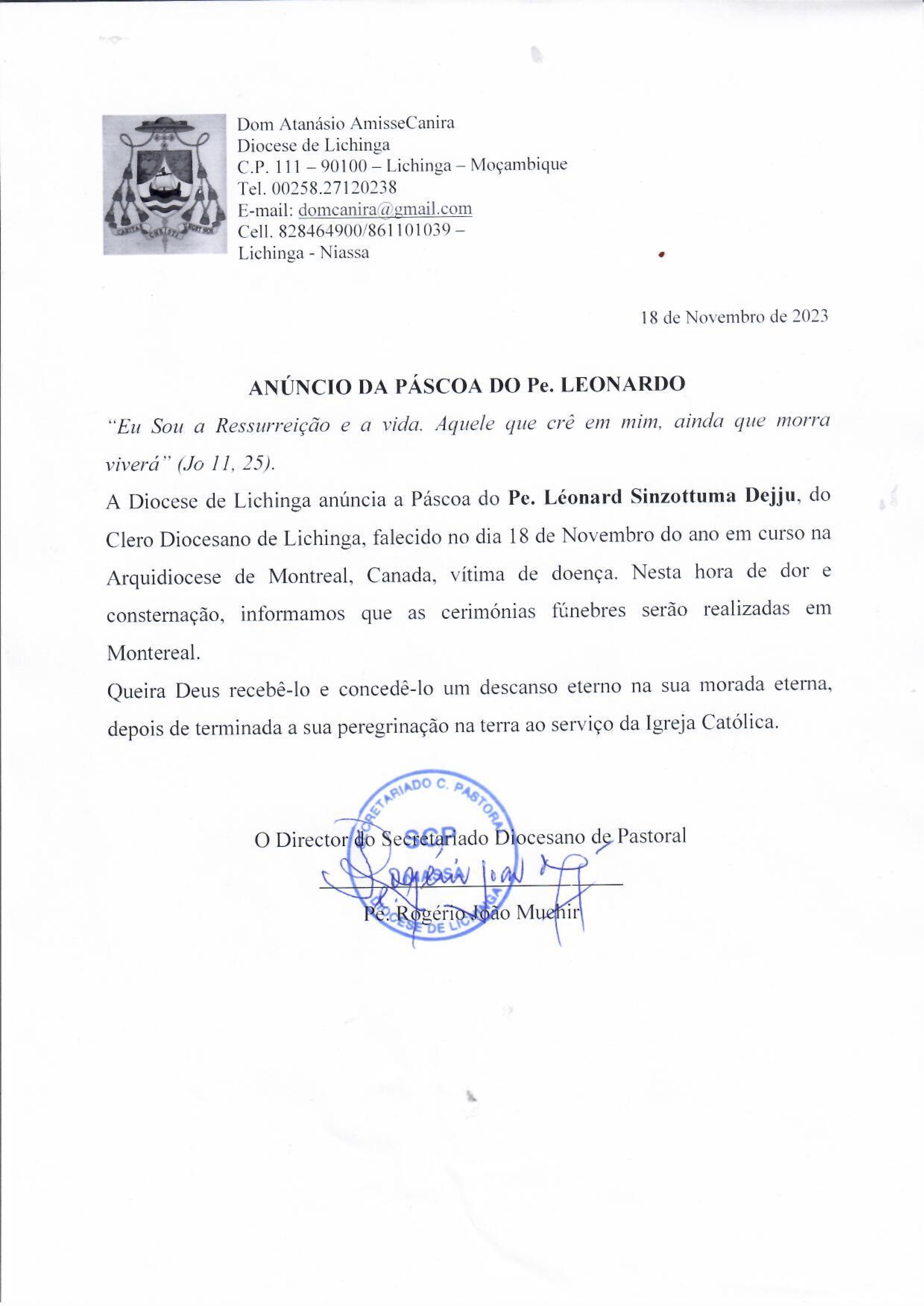 Anexamos a nota de falecimento da Diocese de Lichinga, Moçambique, da qual o Padre Leonardo era presbítero.