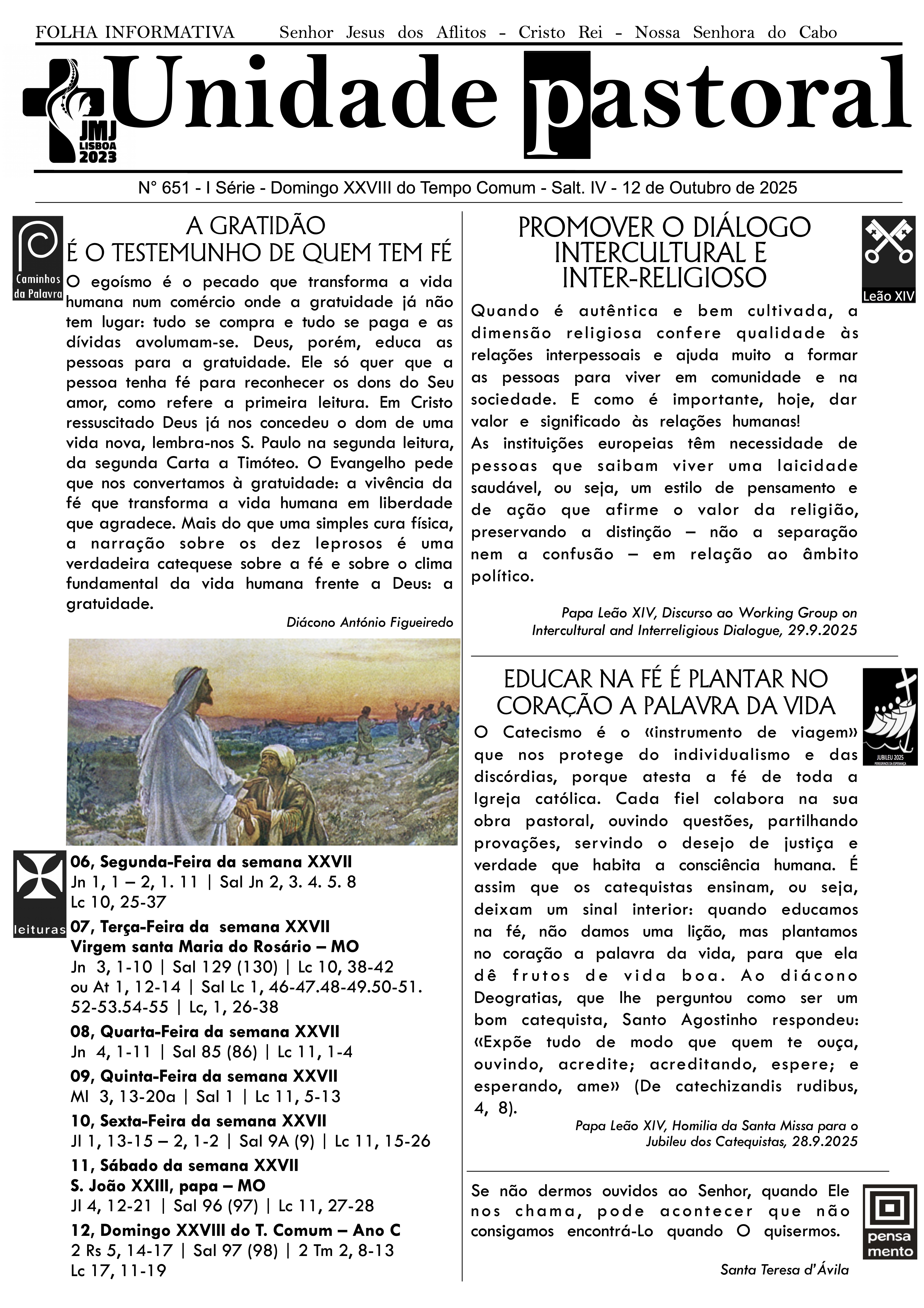 Na sexta-feira, dia 17, às 21h30, na igreja paroquial. Continuamos a rezar pela paz, como nos pede o Santo Padre.