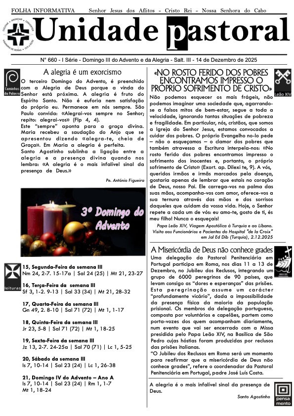 No Domingo, dia 21, NÃO HÁ missa às 9h30. Convidamos todos a estar na missa com o Senhor Bispo, às 11h30.
