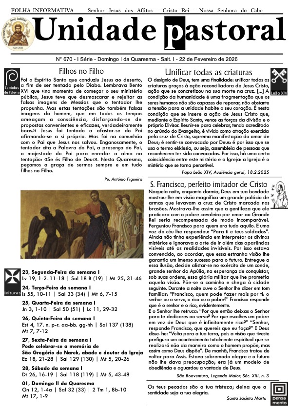 Recordamos que há confissões diariamente, entre as 18h15 e as 19h00. Também após a Missa das 19h00, pedindo directamente ao sacerdote, na sacristia.