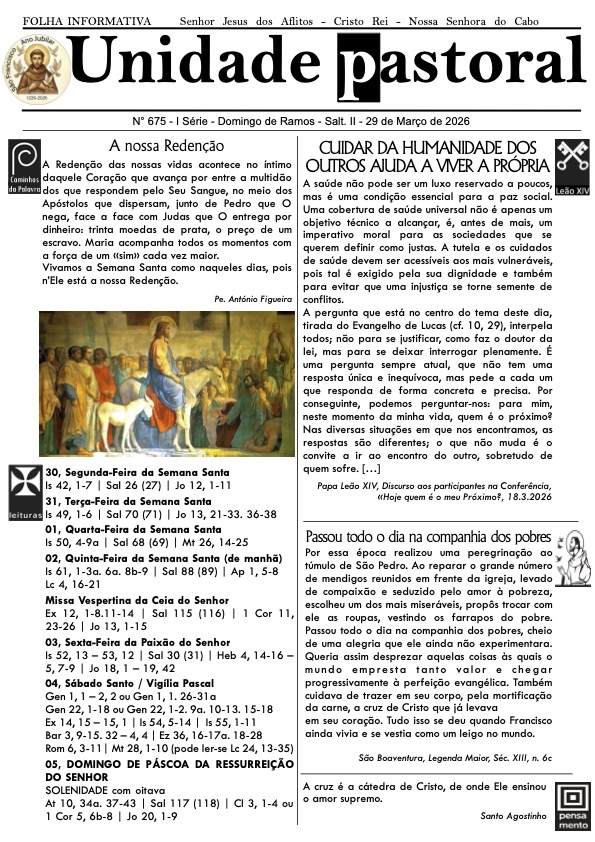 RENÚNCIA QUARESMAL: estão disponíveis na igreja os envelopes para entrega da renúncia quaresmal. Neste ano, destina-se a apoiar as vítimas da tempestade kristin. Será recolhida no Domingo de Ramos.