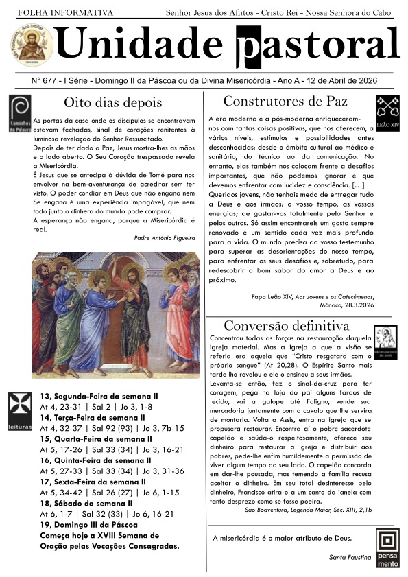Neste Domingo, dia 12 de Abril, Oitava da Páscoa, teremos exposição do Santíssimo a partir das 14h45. Oração do ‘terço da misericórdia’ às 15h. O Santíssimo ficará exposto até às 19h.